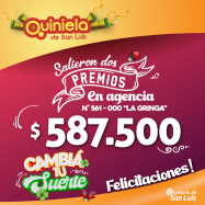¡Salio un premio de quiniela en San Luis! El dia Miercoles 04 de Septiembre, en la agencia N°561-000 "La Gringa" de San Luis,Salio un premio de quiniela de $587.500  ¡Felicidades al Ganador!
