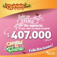 ¡Salió un premio de Quiniela en Villa Mercedes! El día Jueves 29 de Agosto, en la Agencia N°340-000 "La Gran Chance" de Villa Mercedes, salió un premio de Quiniela de $407.000 ¡Felicitaciones al afortunado ganador!