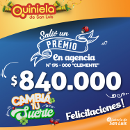 ¡Salió un premio de Quiniela en San Luis! El día Martes 03 de Septiembre, en la Agencia N° 176-000 "Clemente" de San Luis, salió un premio de Quiniela de $840.000 ¡Felicitaciones al afortunado ganador!