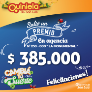¡Salio un premio de quiniela en San Luis!El dia Jueves 08 de Agosto, en la agencia N°250-000 "La Monumental"de San luis, salió un premio de quiniela $385.000 ¡Felicitaciones al ganador!