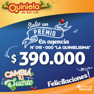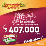 ¡Salió un premio de Quiniela en San Luis! El día Martes 06 de Agosto, en la Agencia N° 003-001 "Mis Ángeles" de San Luis, salió un premio de Quiniela de $400.000 ¡Felicitaciones al afortunado ganador!