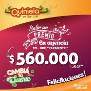 ¡Salio un premio de quiniela en San Luis! El dia Jueves 08 de Agosto, en la agencia 176-000 "Clemente" de San Luis salio un premio de quiniela de $560.000 ¡Felicidades al Ganador!
