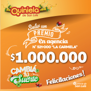 ¡Salió un premio de Quiniela San Luis! El dia Miércoles 31 de Julio, en la Agencia N° 521-000 "La Carmela" de San Luis salió un premio de Quiniela de $1.000.000. ¡Felicitaciones al afortunado ganador!