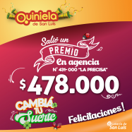¡Salió un premio de Quiniela en Villa Mercedes! El dia Lunes 29 de Julio, en la Agencia N° 431-000 "La Precisa" de Villa Mercedes salió un premio de Quiniela de $478.000. ¡Felicitaciones al afortunado ganador!