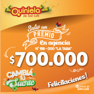 ¡Salió un premio de Quiniela en Villa Mercedes! El dia Sábado 27 de Julio, en la Agencia N° 158-000 "La Taba" de Villa Mercedes salió un premio de Quiniela de $700.000. ¡Felicitaciones al afortunado ganador!