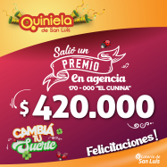 ¡Salió un premio de Quiniela en Tilisarao! El dia Sábado 27 de Julio, en la Agencia N° 170-000 "El Cunina" de Tilisarao salió un premio de Quiniela de $420.000. ¡Felicitaciones al afortunado ganador!