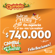 ¡Salió un premio de Quiniela en Villa Mercedes! El dia Sábado 27 de Julio, en la Agencia N° 324-000 "Los Sueños" de Villa Mercedes salió un premio de Quiniela de $740.000. ¡Felicitaciones al afortunado ganador!