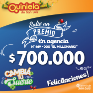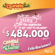 ¡Salió un premio de Quiniela en San Luis! El dia Sábado 27 de Julio, en la Agencia N° 007-000 "La Millonaria" de San Luis salió un premio de Quiniela de $834.000. ¡Felicitaciones al afortunado ganador!