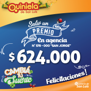 ¡Salió un premio de Quiniela en Potrero de Los Funes! El dia Sábado 27 de Julio, en la Agencia N° 578-000 "San Jorge" de Potrero de Los Funes salió un premio de Quiniela de $624.000. ¡Felicitaciones al afortunado ganador!
