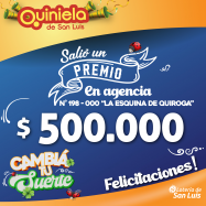 ¡Salió un premio de Quiniela en San Luis!   El día Jueves 16 de Mayo en la agencia Nº 198-000 " La Esquina de Quiroga" de San Luis, salió un premio de Quiniela de $500.000   ¡Felicitaciones al afortunado ganador!