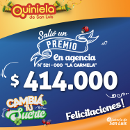 ¡Salió un premio de Quiniela en San Luis!   El día Jueves 16 de Mayo en la agencia Nº 521-000 " La Carmela" de San Luis, salió un premio de Quiniela de $414.000   ¡Felicitaciones al afortunado ganador!