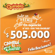 ¡Salió un premio de Quiniela en San Luis!   El día Sábado 11 de Mayo en la agencia Nº 003-000 " Mis Ángeles" de San Luis salió un premio de Quiniela de $505.000   ¡Felicitaciones al afortunado ganador!