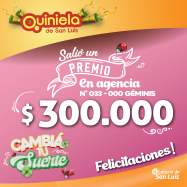 ¡Salió un premio de Quiniela en San Luis!   El día Sábado 11 de Mayo en la agencia Nº 033-000 " Géminis" de San Luis salió un premio de Quiniela de $300.000   ¡Felicitaciones al afortunado ganador!
