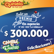 ¡Salió un premio de Quiniela en Villa Mercedes!   El día Sábado 11 de Mayo en la agencia Nº 412-000 " La Cábala II" de Villa Mercedes salió un premio de Quiniela de $300.000   ¡Felicitaciones al afortunado ganador!